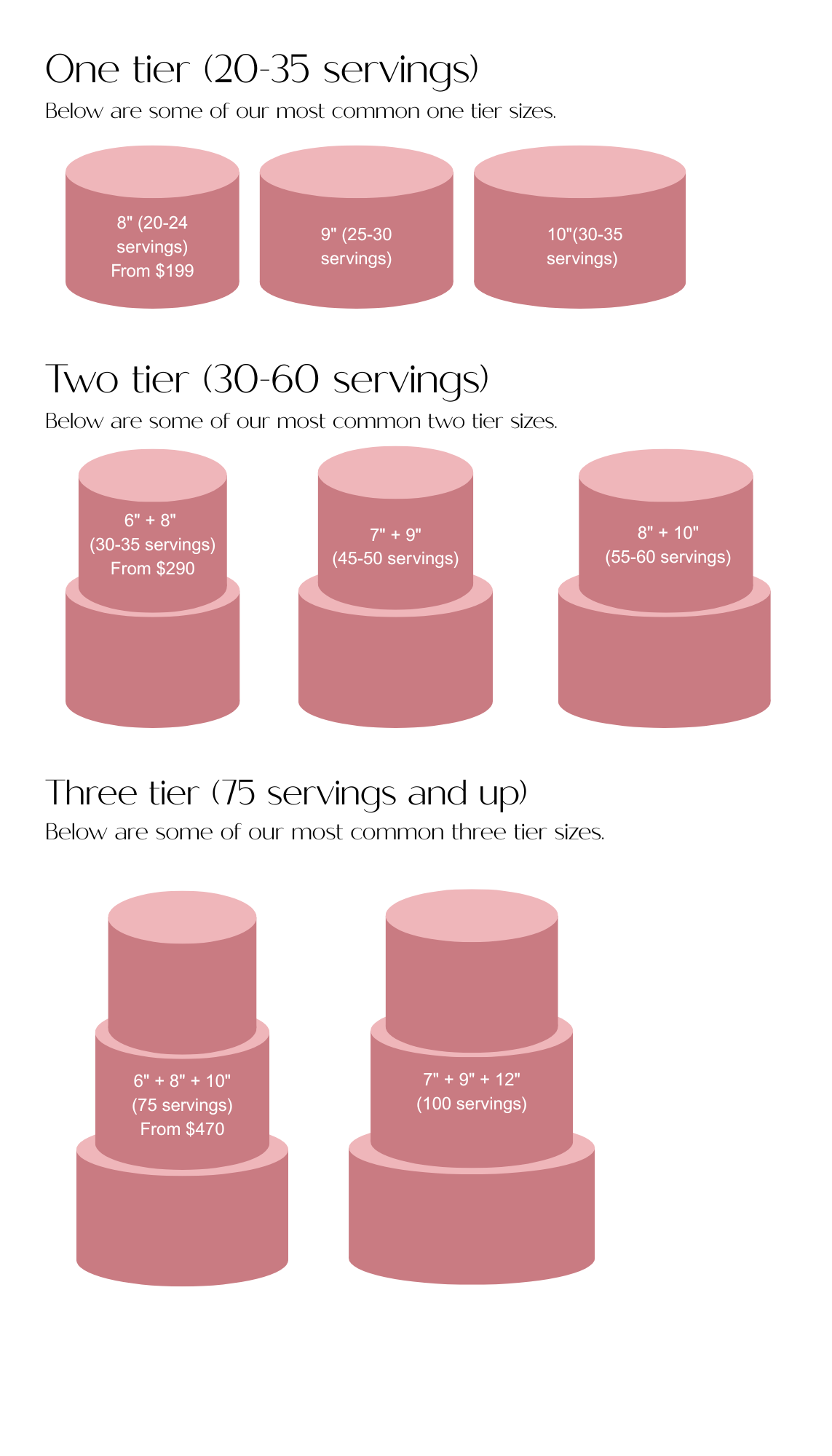 Our cakes are priced based on size, number of servings, and design complexity. Below are starting prices to help guide your expectations: